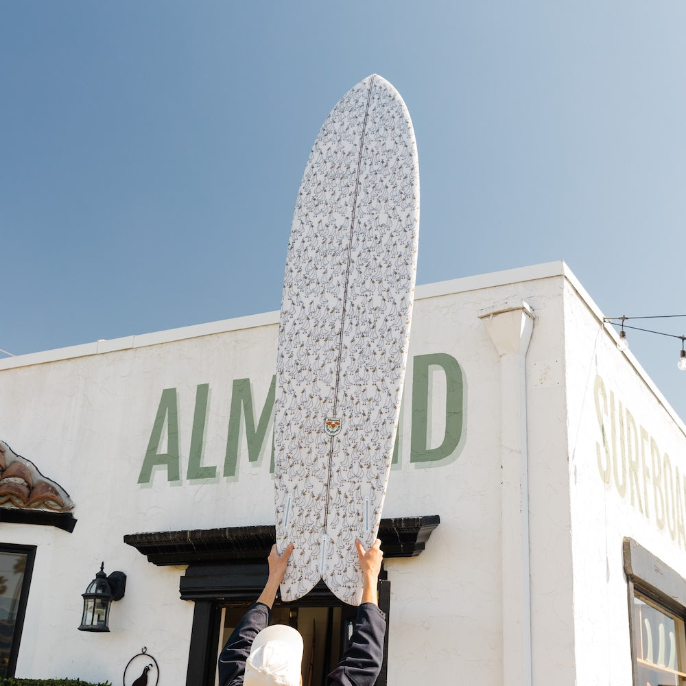 Every Almond board begins as a blank and ends as a hand-shaped piece of California craftsmanship. Each curve, foil, and rail line is refined through years of shaping and feedback from real surfers. We build boards that hold up for decades and ride beautifully in everyday conditions.