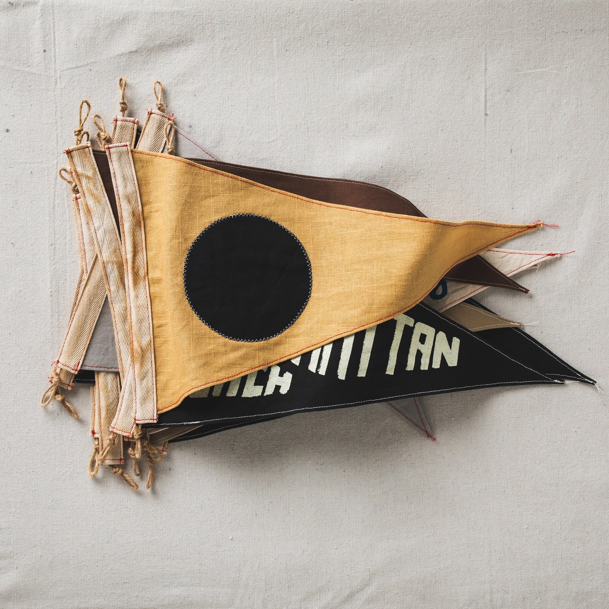Each flag is hand-painted, stitched and prepared to be hung with photo, art or object collections